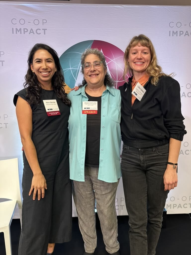 Later that week we could be seen at the 2025 Cooperative IMPACT Conference – NCBA CLUSA. Rebecca moderated a discussion with members of two media cooperatives, Defector  and 51st.news. As a result of two union classes with the Consortium for Worker Education and Writers Guild of America East; Coops 101, we have been getting to know more writers and more media coops. This conversation with media coops added to the overall theme of the conference about how the power of stories is so critical to spreading the message of coops and why they are such critical and effective building blocks towards a more just and sustainable world. In this photo you can see Rebecca with Jasper Wang from Defector and Maddie Poore from 51st. Defector has quickly become a go-to model for how to build a cooperative from the ashes of the old, as several laid off workers from Deadspin started Defector during COVID. Maddie frames the experience with this story; This moment isn’t normal, but here’s our glimmer of hope