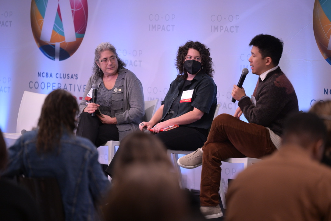 Later that week we could be seen at the 2025 Cooperative IMPACT Conference – NCBA CLUSA. Rebecca moderated a discussion with members of two media cooperatives, Defector  and 51st.news. As a result of two union classes with the Consortium for Worker Education and Writers Guild of America East; Coops 101, we have been getting to know more writers and more media coops. This conversation with media coops added to the overall theme of the conference about how the power of stories is so critical to spreading the message of coops and why they are such critical and effective building blocks towards a more just and sustainable world. In this photo you can see Rebecca with Jasper Wang from Defector and Maddie Poore from 51st. Defector has quickly become a go-to model for how to build a cooperative from the ashes of the old, as several laid off workers from Deadspin started Defector during COVID. Maddie frames the experience with this story; This moment isn’t normal, but here’s our glimmer of hope